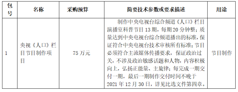 中国健康教育中心就 “央视《人口》栏目节目制作项目”进行比选采购,现邀请合格供应商参加比选响应。