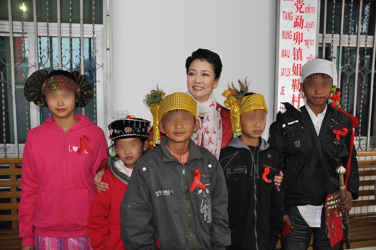 2009年,彭丽媛参加禁毒防艾边疆行活动时同受艾滋病影响儿童在一起