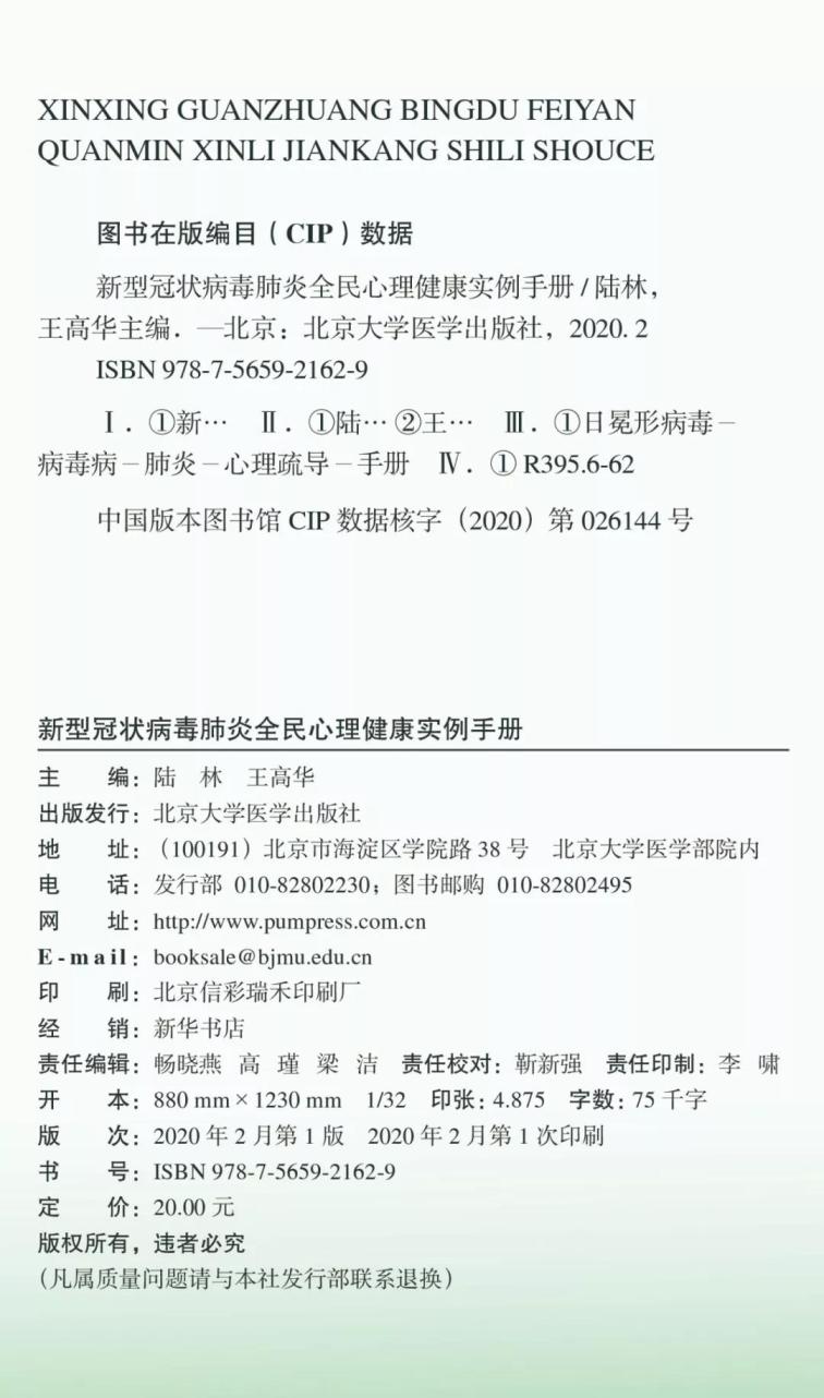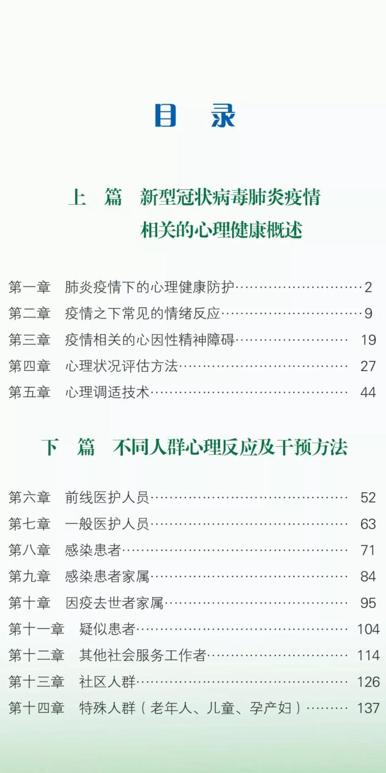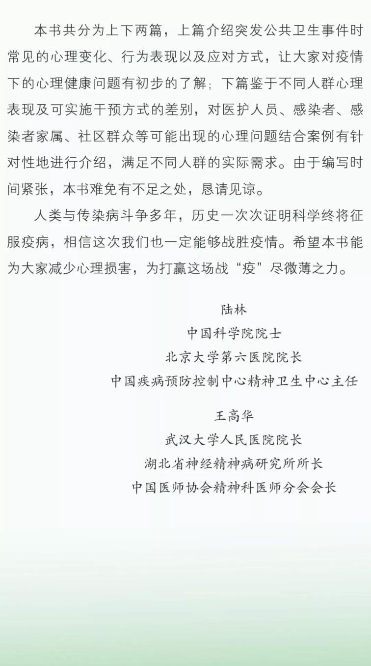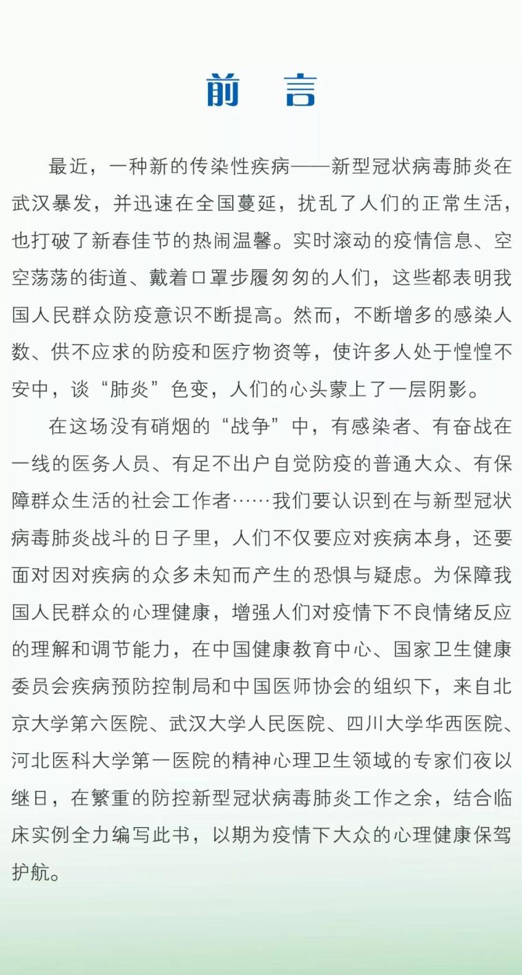 为了缓解人们的心理压力,增强人们对疫情下不良情绪反应的理解和调节能力,由中国健康教育中心会同委疾病预防控制局、中国医师协会组织编写的《新型冠状病毒肺炎全民心理健康实例手册》现正式出版。本书由北京大学第六医院陆林院士、武汉大学人民医院王高华院长主编, 多位相关领域专家们夜以继日倾力编写,内容全面、系统,理论与实例结合,覆盖不同人群的心理需求,给予权威心理防护与应对指导。